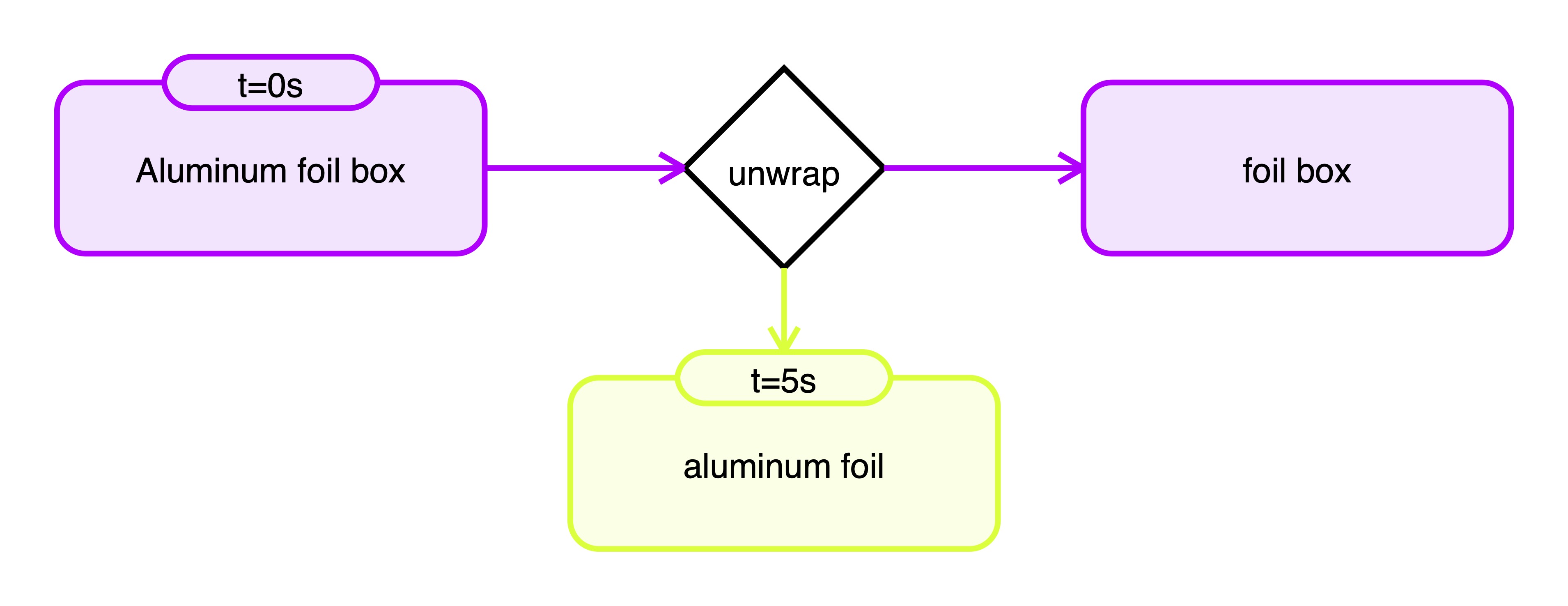 (3) Finally, for each added track, we prompt a vision-language model to build a state graph for each detected transformation and its resulting effect ("Predicted State Graph", Bottom).